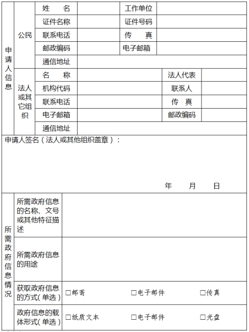 申请人通过现场、信函、传真和电子邮件提出申请的,应填写《辽宁省司法厅政府信息公开申请表》(以下简称《申请表》,详见附件1),书面《申请表》可在省司法厅办公室领取或从门户网站信息公开指南下载打印。
