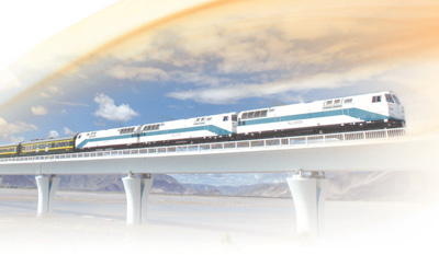 | 2006年7月1日,青藏铁路全线通车,从西藏拉萨开出的列车在铁轨上飞驰。 |