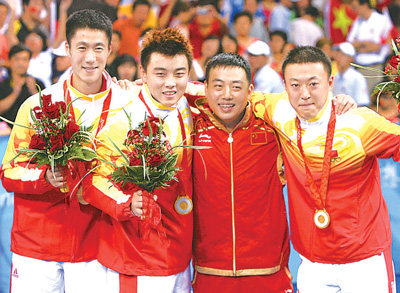 | 2008年8月17日,北京奥运会,乒乓球男团颁奖仪式。 |