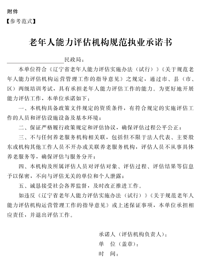 为深入贯彻落实《党中央 国务院关于深化养老服务改革发展的意见》(中发〔2024〕32号)、《辽宁省人民政府办公厅关于印发〈辽宁省推进基本养老服务体系建设实施方案〉的通知》(辽政办发〔2023〕11号)精神,健全老年人能力评估工作机制,规范全省老年人能力评估工作,根据《关于做好〈老年人能力评估规范〉国家标准宣贯工作的通知》(辽民老函〔2023〕139号)、《关于印发〈辽宁省老年人能力评估实施办法(试行〉的通知》(辽民发〔2024〕1号)规定,结合全省工作实际,现就规范全省老年人能力评估机构管理提出如下指导意见: