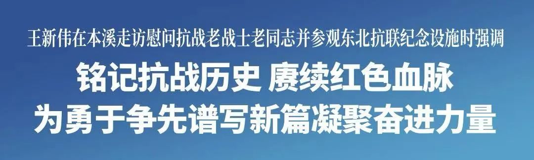 在纪念中国人民抗日战争暨世界反法西斯战争胜利80周年之际,按照省委统一安排,8月26日,省委副书记、省长王新伟到本溪市走访慰问抗战老战士老同志,为他们颁发“中国人民抗日战争胜利80周年”纪念章,致以崇高敬意和诚挚问候,并参观东北抗联史实陈列馆等抗联纪念设施。